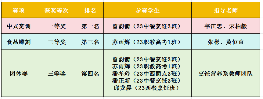 本次我校派出5名队员参加全部赛项,他们沉着应对、发挥稳定、配合默契,取得优异成绩。赛场上,曾韵衡同学凭借融合桂菜与东盟饮食文化的创新菜品,荣获中式烹调赛项一等奖(第一名);苏雨辉同学以精湛刀工创作兼具美感与内涵的优秀作品,荣获食品雕刻赛项三等奖(第四名);潘冬玲、潘正新、邱龙晨等同学也在各自参赛赛项中奋勇拼搏、取得佳绩。最终我校参赛队伍总分排名第四,荣获团体三等奖。