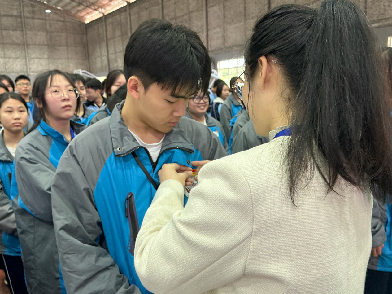 校团委书记谢冰梅为新团员佩戴团徽
