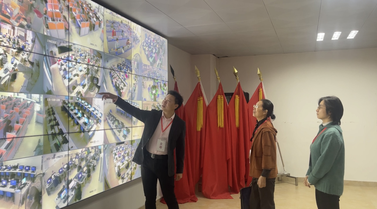 学校商贸系副主任杜国宁(左一)陪同广西注册税务师协会副秘书长覃美云(中)巡视标准化考场监控室