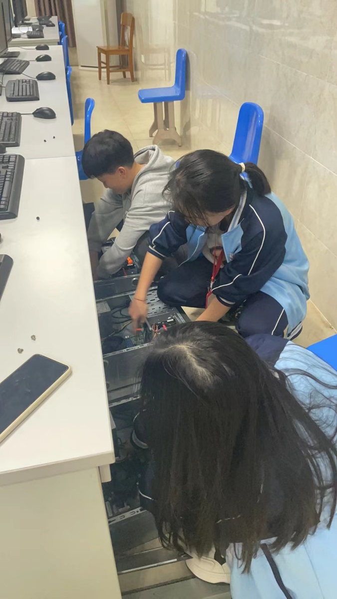 学生志愿者对实训室电脑进行维护