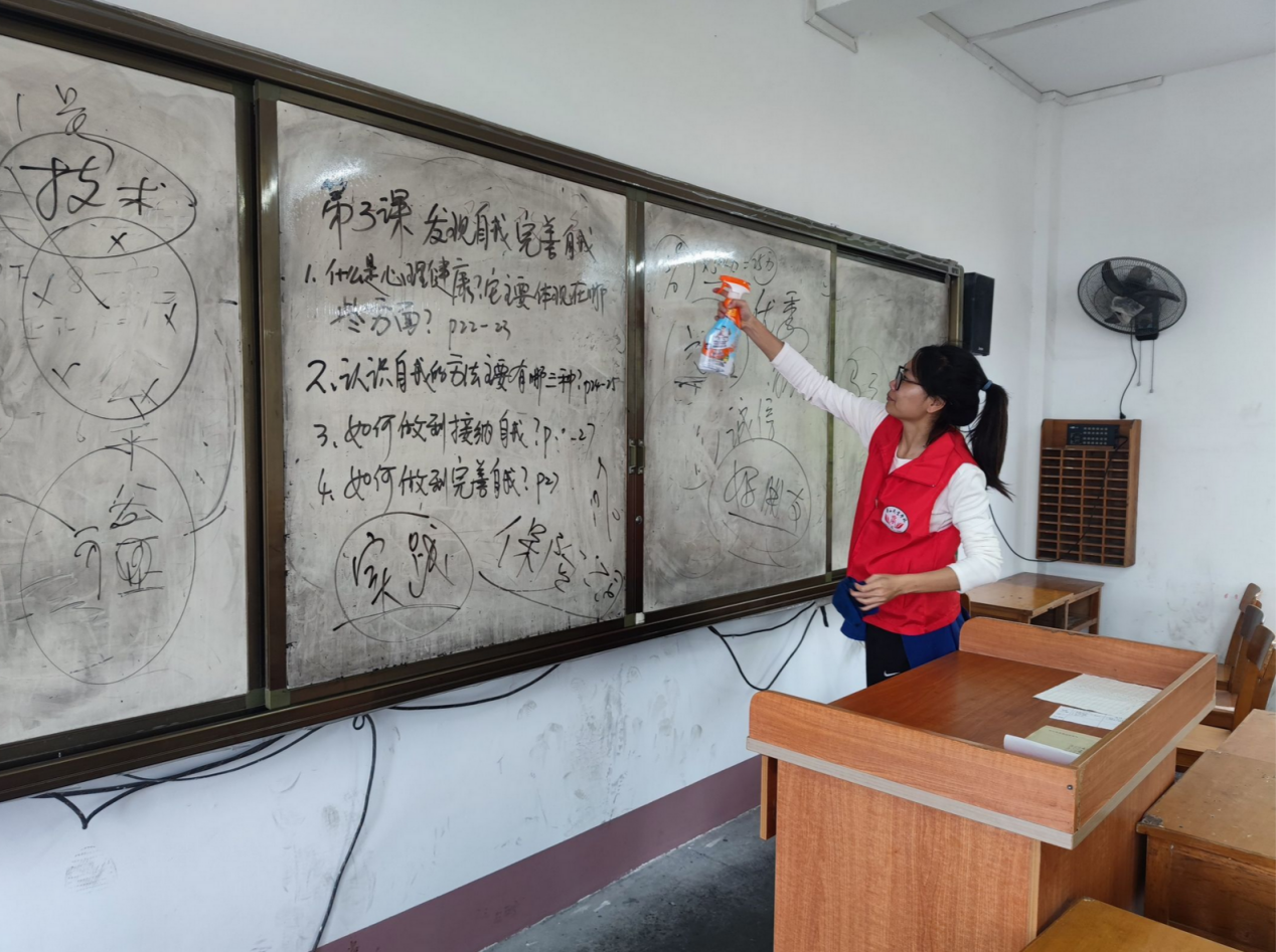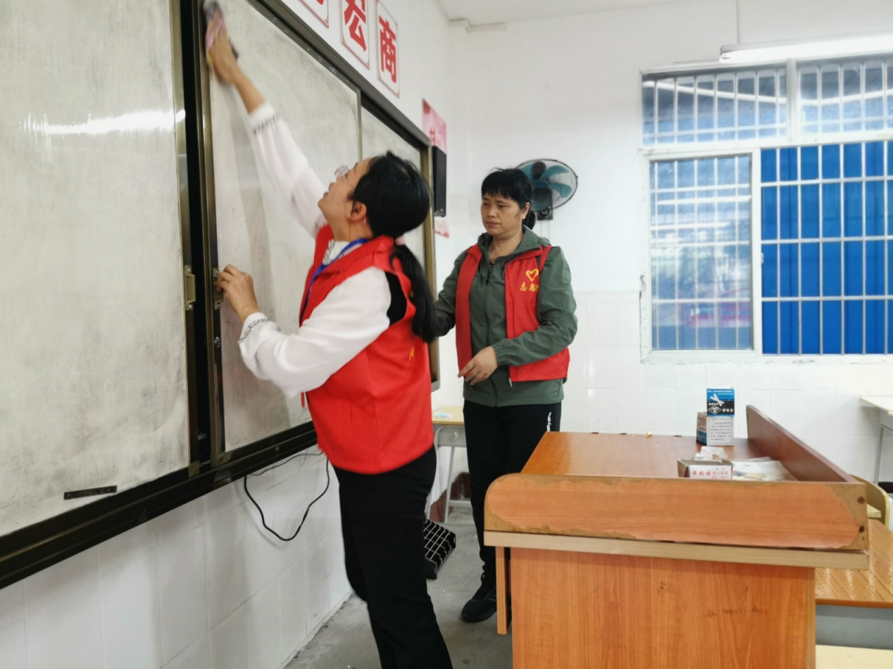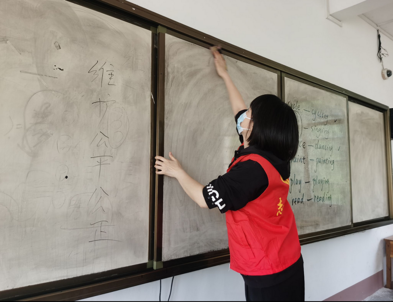 在本次活动中,党员同志们积极发挥带头作用,认真擦拭着满是陈旧污渍的黑板。学生志愿者们看着老师们卖力、认真的劲头也深受感染,积极地拿起擦黑板的工具,投入到劳动之中。他们专注而热情地擦拭着每一块黑板,让原本蒙尘的黑板重新焕发出洁净的光彩,仿佛是一张张充满快乐与活力的笑脸,在向全体师生传递着积极参与和向上进取的信息。