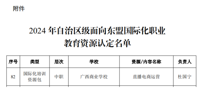 近日,自治区教育厅公布了2024年面向东盟国家的国际化职业教育资源认定结果,我校财经商贸系杜国宁老师负责的《直播电商运营》国际化培训资源包被认定为2024年自治区级面向东盟国际化职业教育资源。这不仅是我校高质量发展取得的突出成绩,也标志着我校在东盟国际化职业教育领域实现了历史性突破。