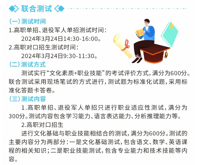 单招考试科目分为公共基础课和职业适应性测试,公共基础课使用普通高中学业水平考试(简称学业考试)语文、数学、外语(一般为英语,其他语种参照实施)3门科目分数。职业适应性测试根据专业大类采用2门或3门专业基础课合卷。